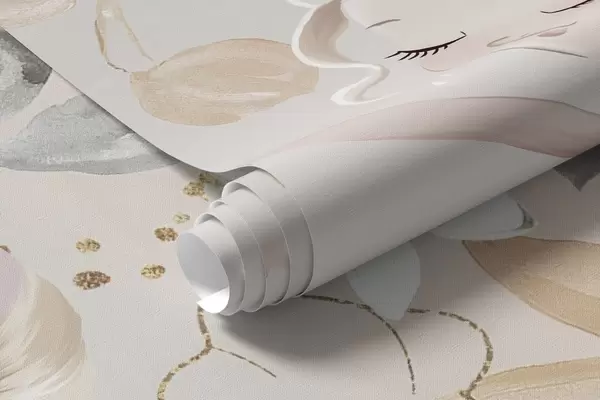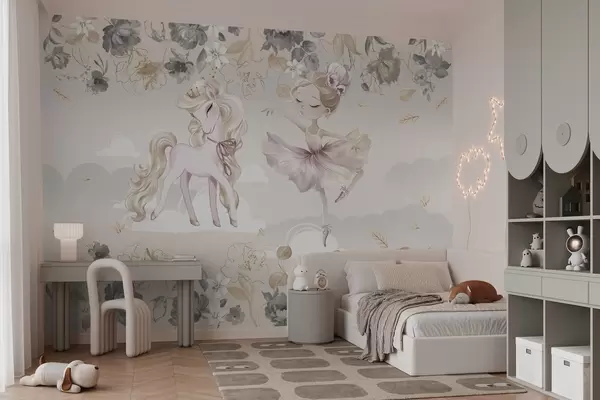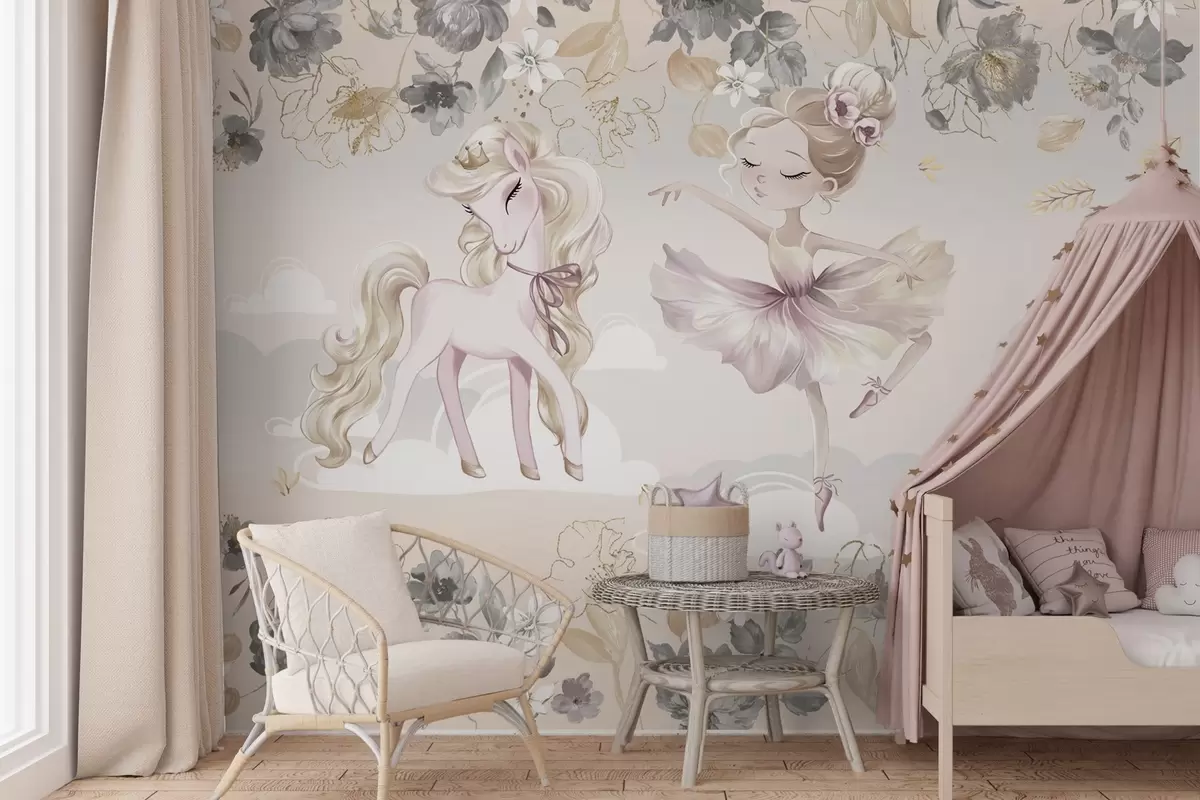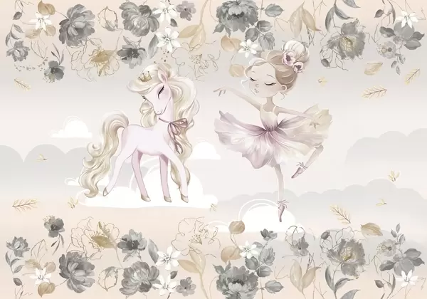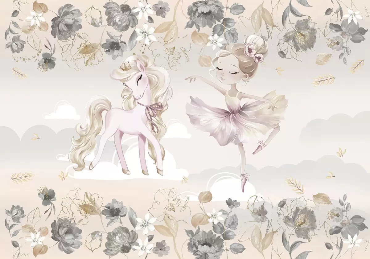 Fototapeten Schneeweißes Pony und Ballerina zwischen Blumen und Wolken N° w04419