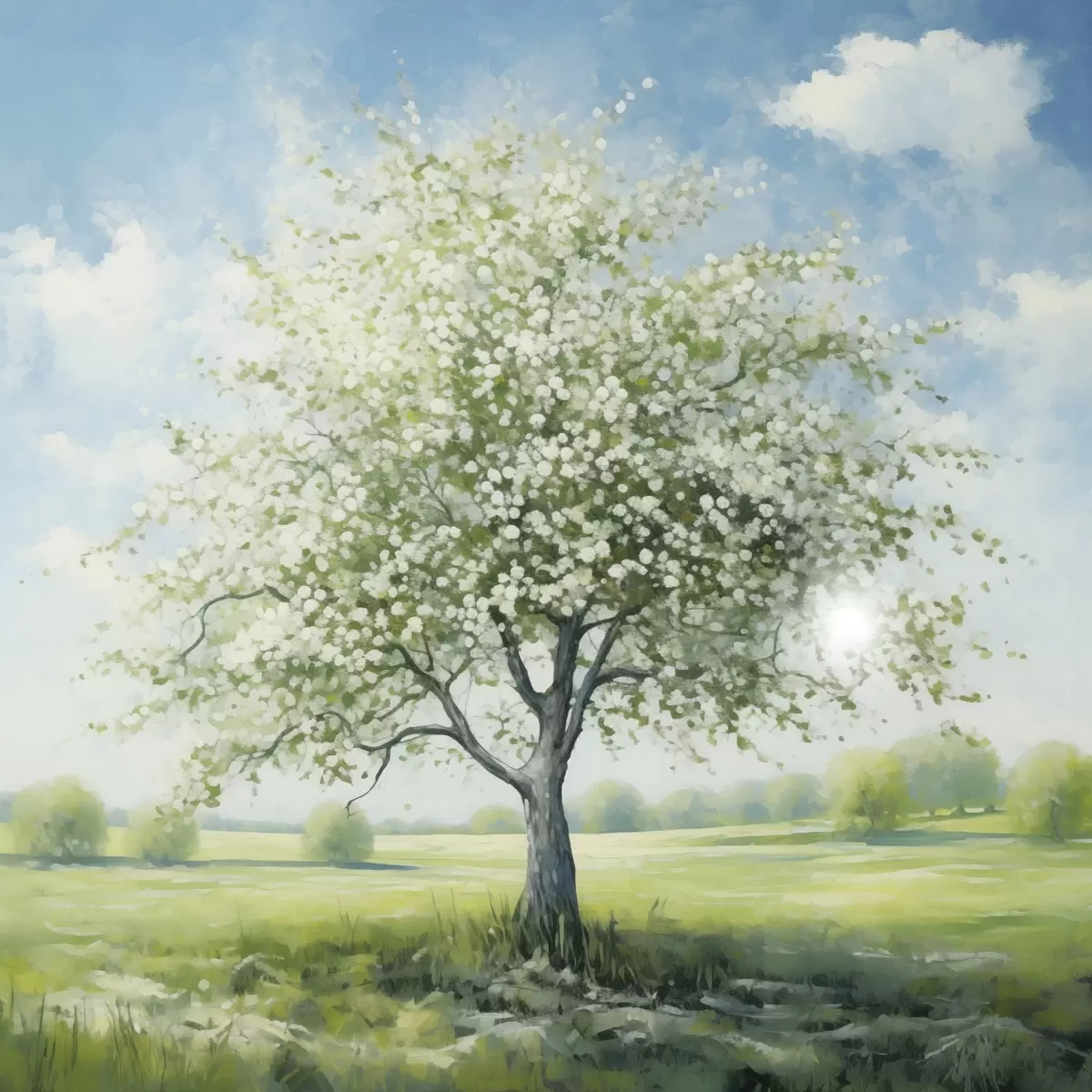 Fototapeten Ein einsamer Baum in einem Feld mit weißen Blüten N° w04445
