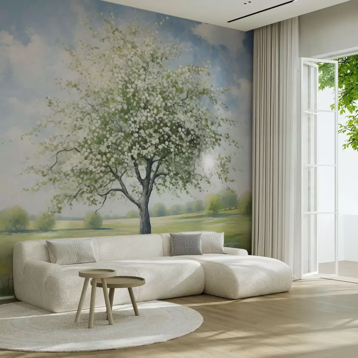 Fototapeten Ein einsamer Baum in einem Feld mit weißen Blüten N° w04445