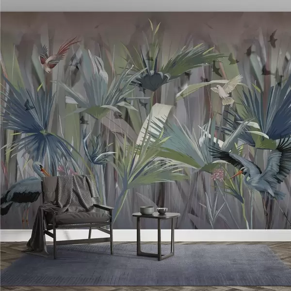 Fototapeten Exotische Vögel zwischen Palmenblättern und Blumen N° w04458