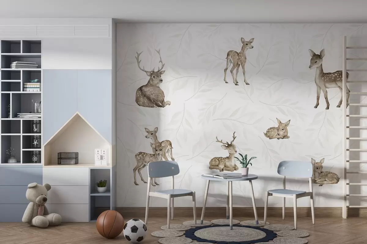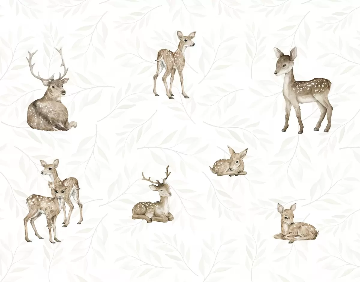 Fototapeten Niedliche Rehkitze auf einem hellen Hintergrund mit Zweigen N° w04461