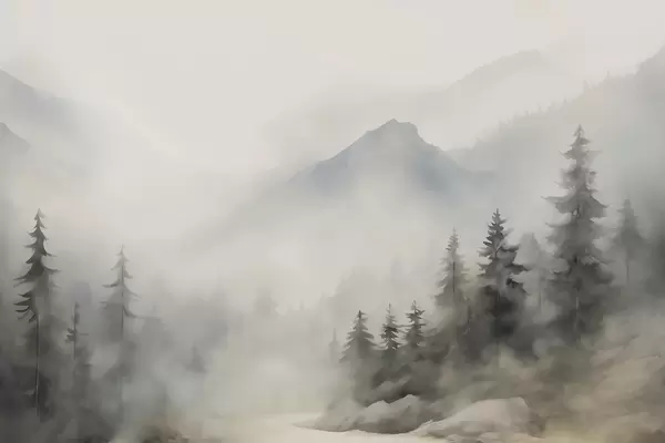 Fototapeten Wald im Nebel vor dem Hintergrund der Berge N° w04493