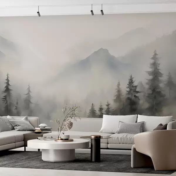 Fototapeten Wald im Nebel vor dem Hintergrund der Berge N° w04493