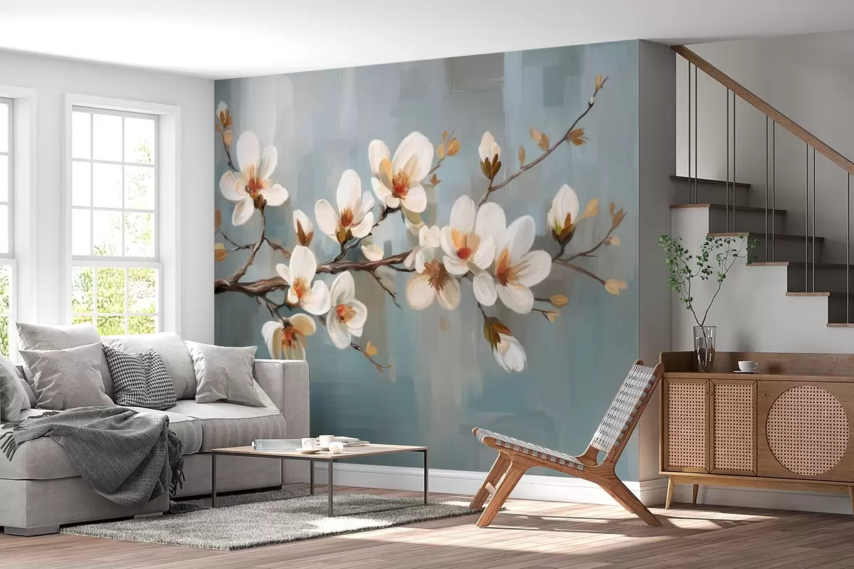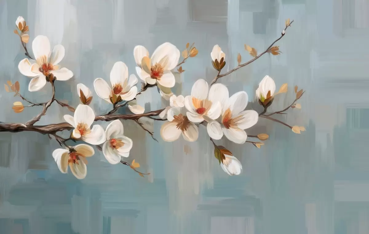 Fototapeten Ein blühender Zweig im Stil der Ölmalerei auf blauem Hintergrund N° w04496