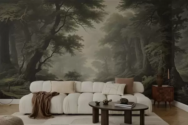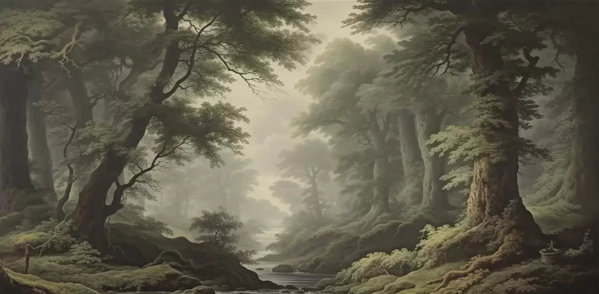 Fototapeten Nebelverhangener Wald mit Fluss und hohen alten Bäumen N° w04555