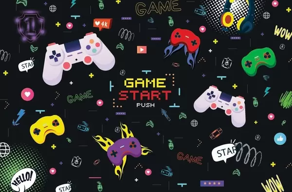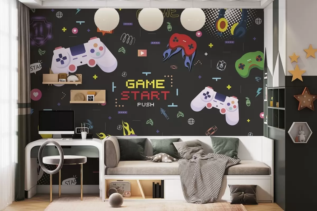 Fototapeten Helles Gamer-Muster mit Konsolen und pixelartigem Text N° w04581