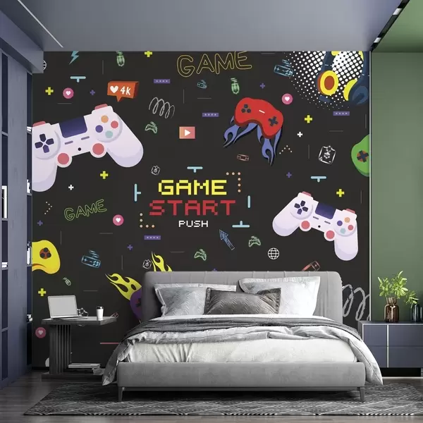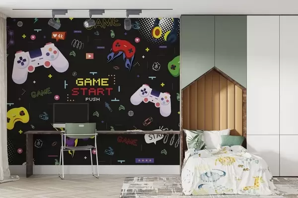 Fototapeten Helles Gamer-Muster mit Konsolen und pixelartigem Text N° w04581