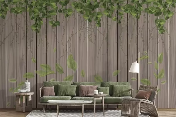 Fototapeten Imitation Holzplatten mit hängenden Blättern N° w04603