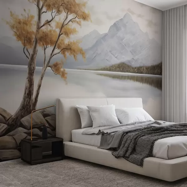 Fototapeten Herbstbaum an einem Bergsee, ruhige Pastelltöne N° w04611