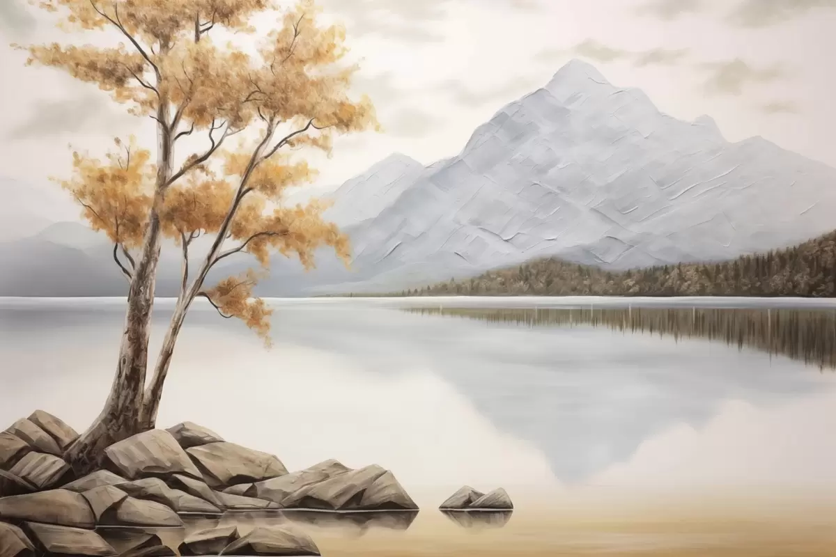 Fototapeten Herbstbaum an einem Bergsee, ruhige Pastelltöne N° w04611
