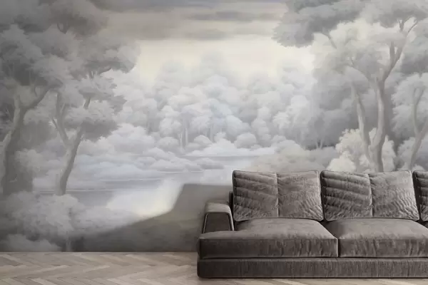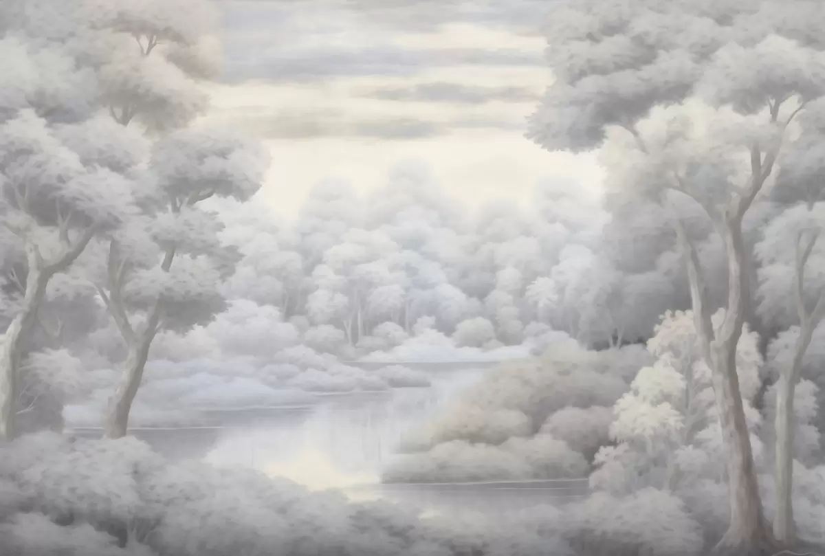 Fototapeten Nebelverhangener Wald und See in sanften Grautönen N° w04617