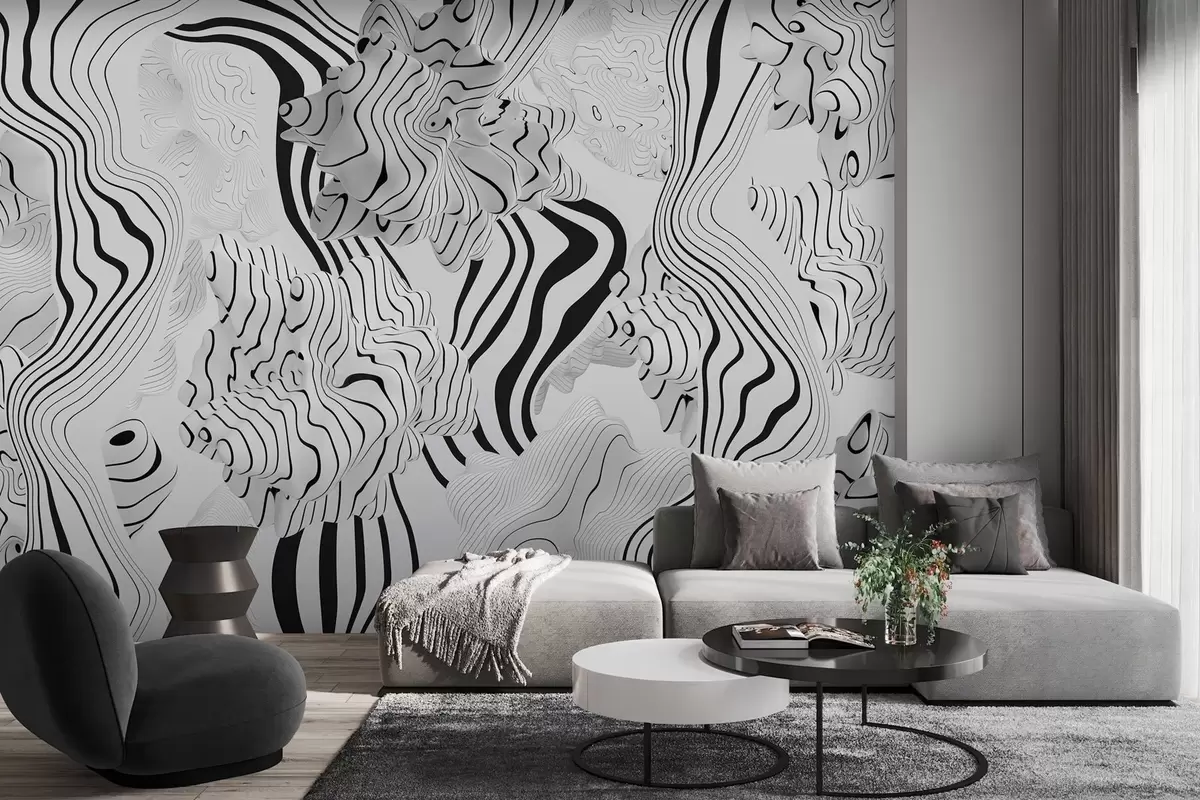 Fototapeten Abstrakte organische Formen im 3D-Stil in Weiß- und Grautönen mit schwarzen Streifen N° w04627