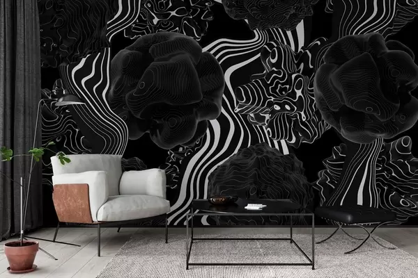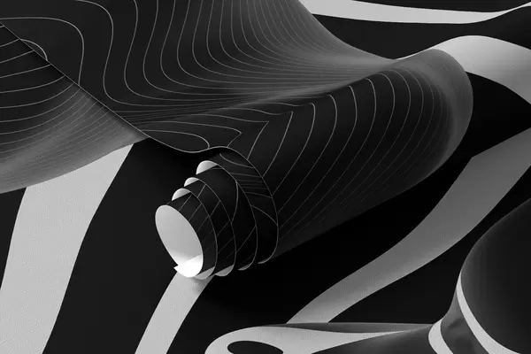 Fototapeten Abstrakte organische Formen im 3D-Stil in Schwarztönen mit weißen Streifen N° w04628