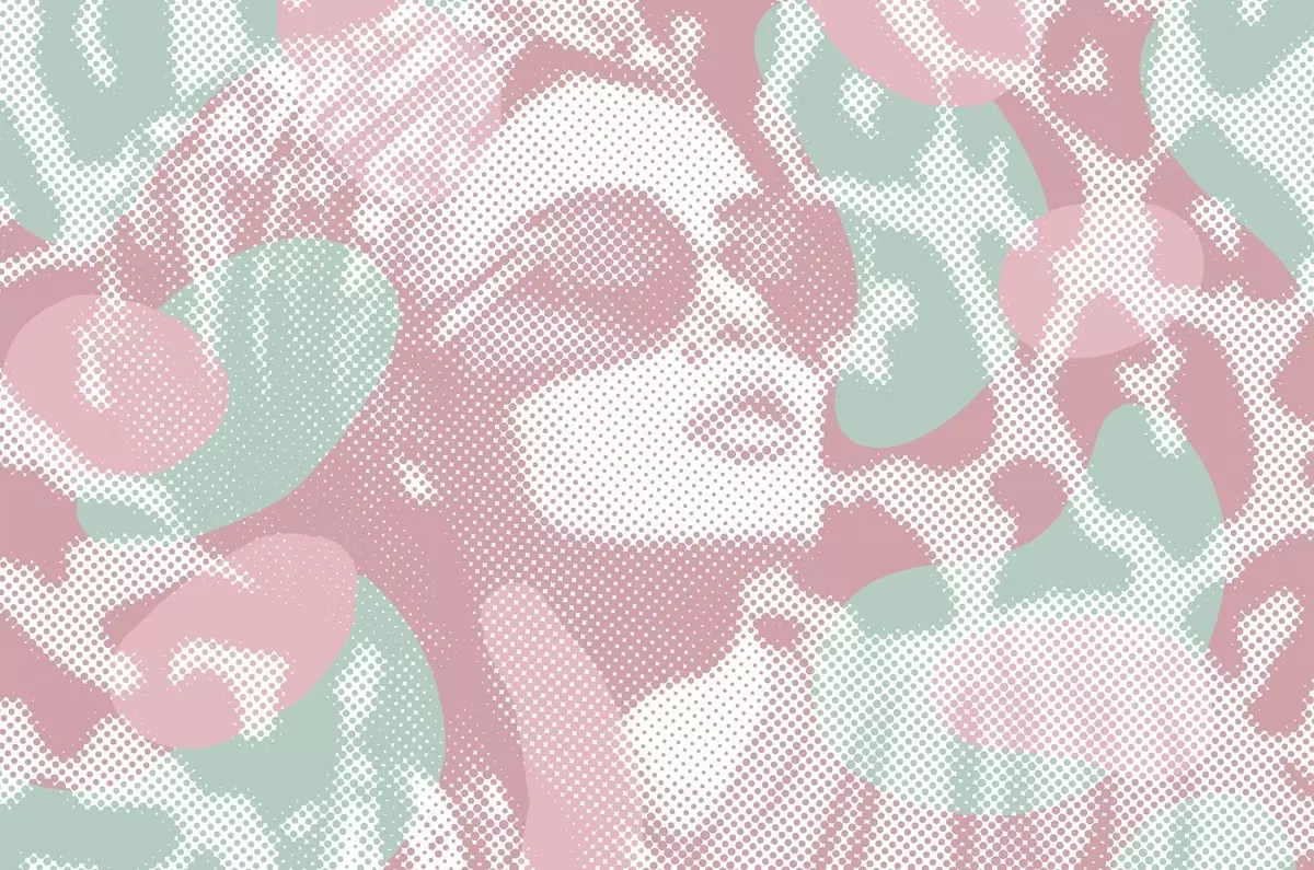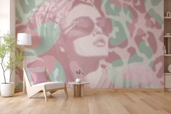 Fototapeten porträt einer Frau vor einem Leopardenhintergrund in einem gepunkteten Stil in Rosa- und Grüntönen N° w04630v2