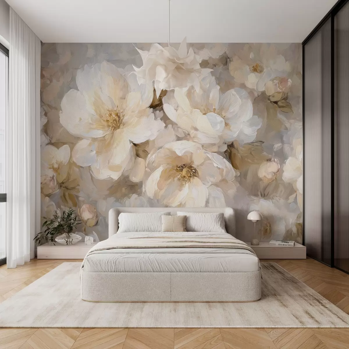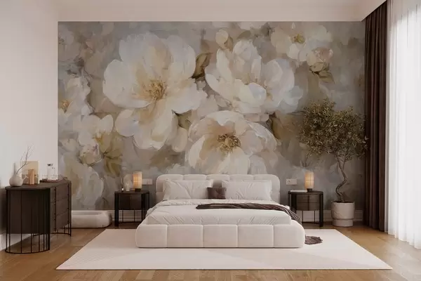 Fototapeten große Blumen in Weiß- und Beigetönen im Stil eines Ölgemäldes N° w04633