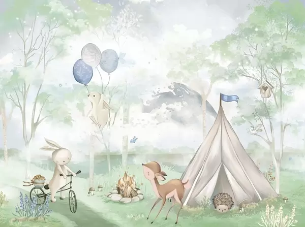 Fototapeten Kindercamp in warmen Beigetönen, Zelt und Waldtiere N° w04671