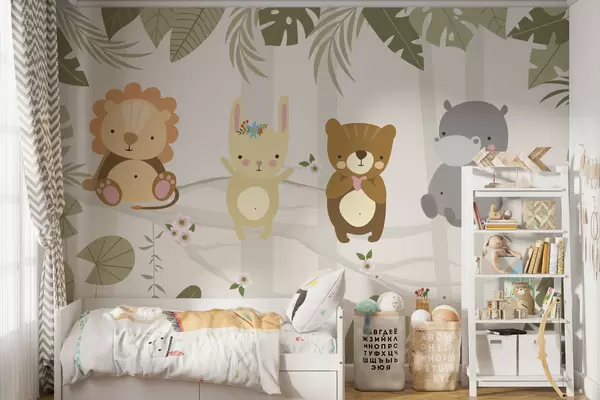 Fototapeten Süßer Löwe, Hase, Bär und Nilpferd zwischen Blättern N° w04682