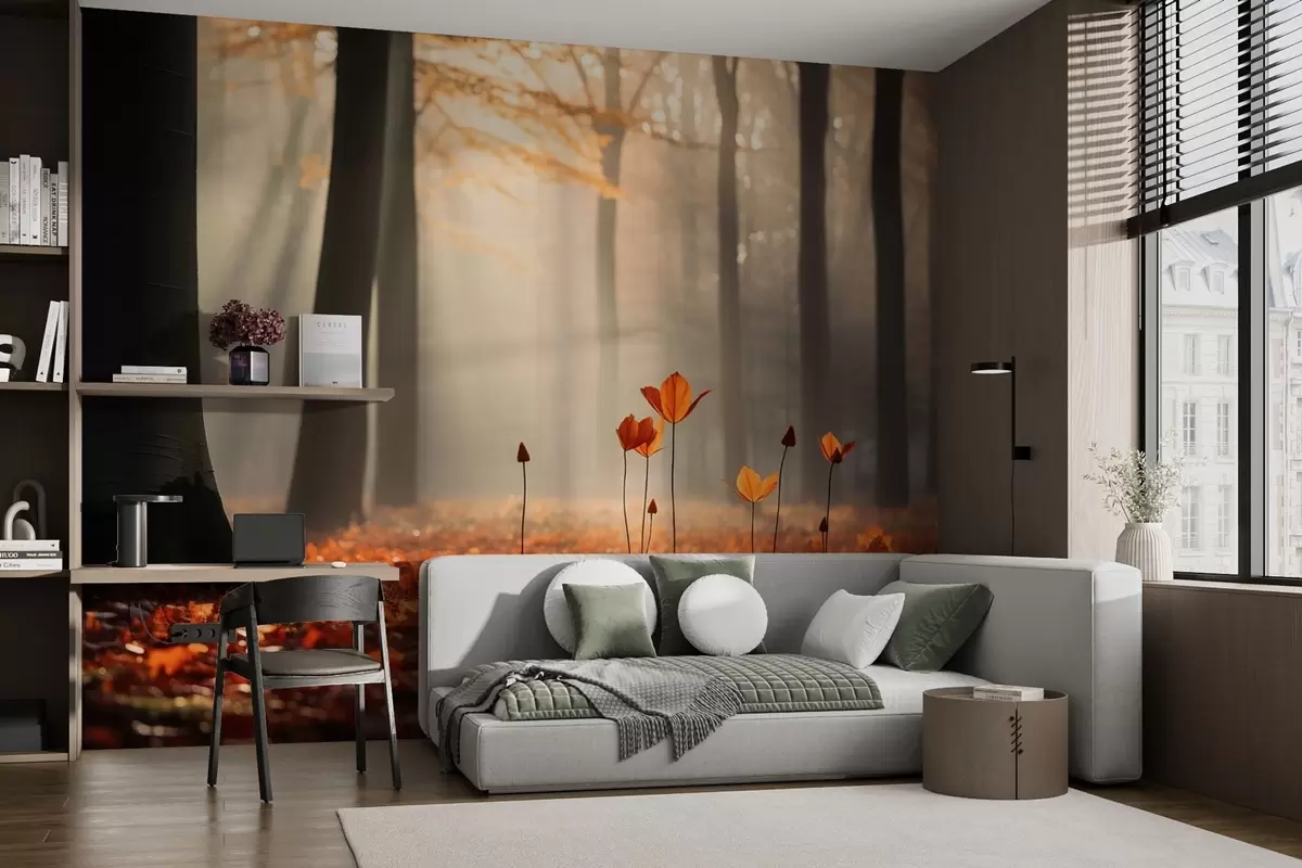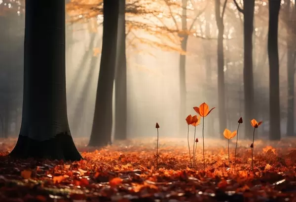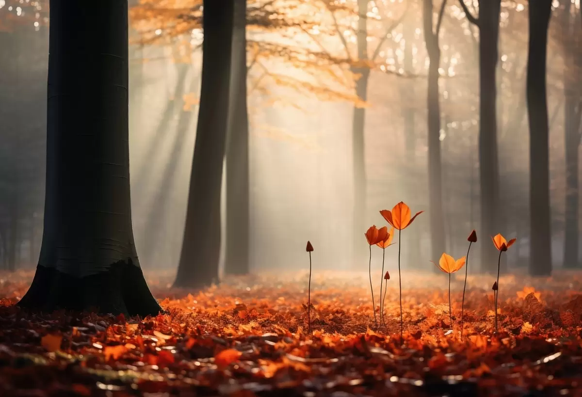 Fototapeten Herbstwald mit Sonnenstrahlen und buntem Laub N° w04710