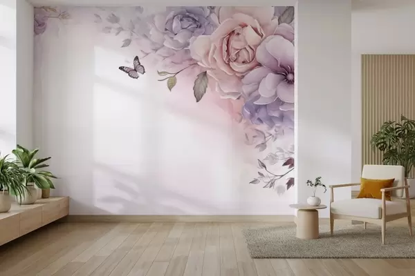 Fototapeten Zarte rosa und lila Blüten mit einem Schmetterling N° w04711