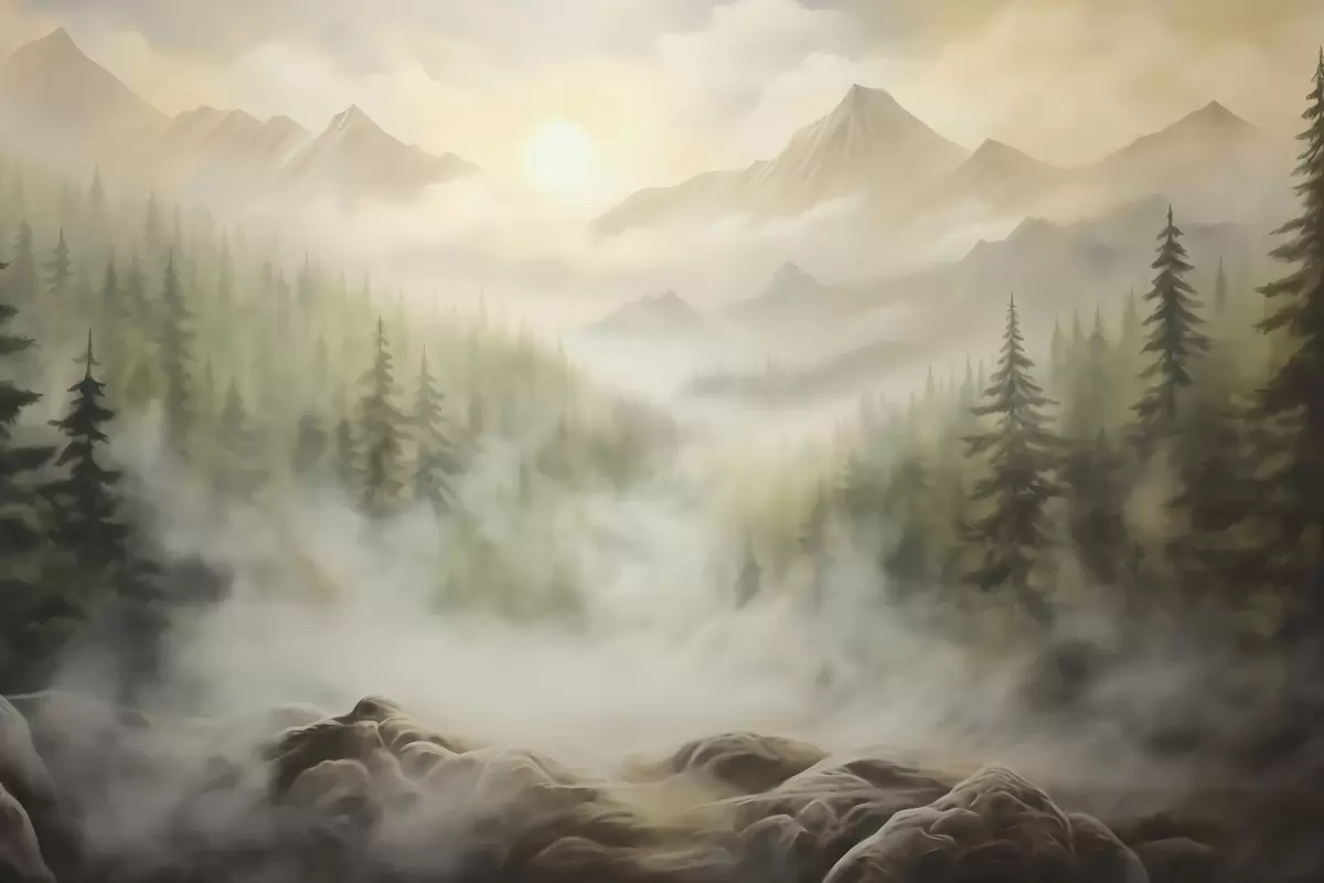 Fototapeten Wald im Nebel vor dem Hintergrund der Berge N° w04730