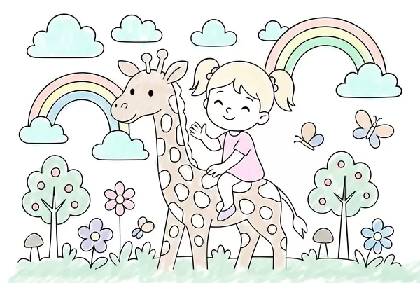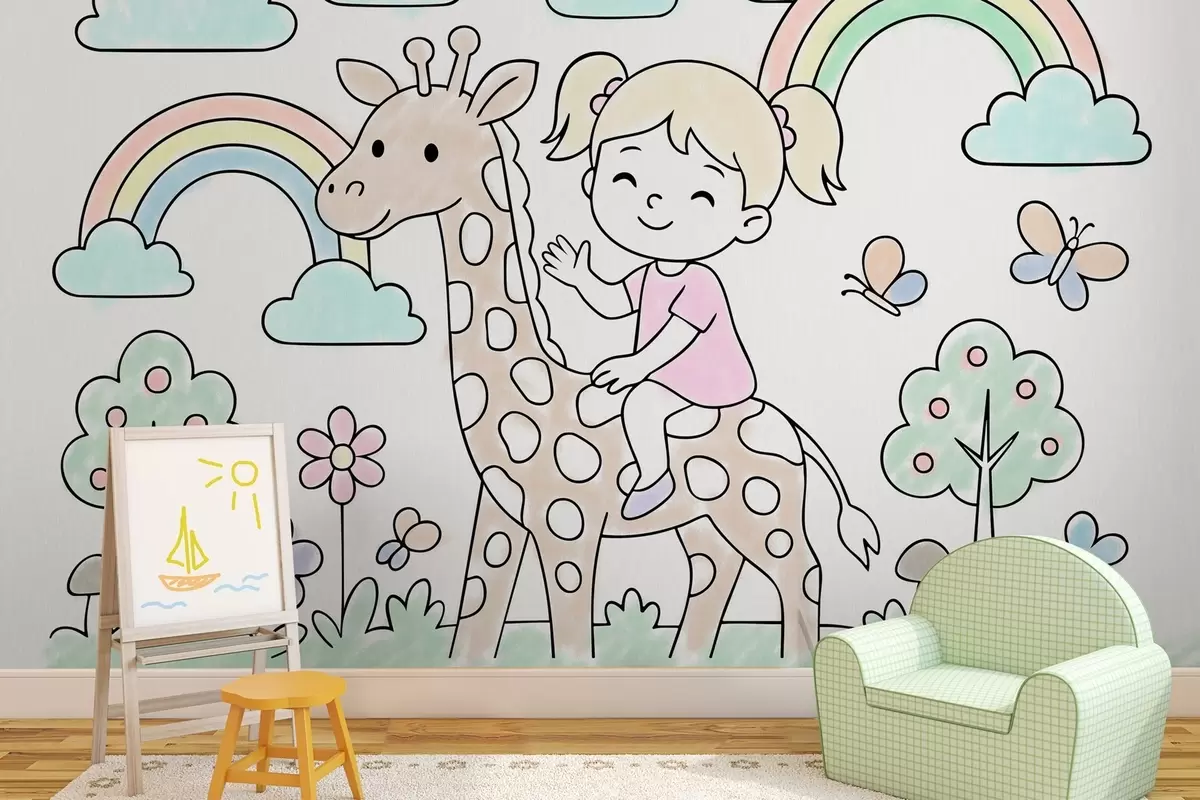 Fototapeten mädchen auf einer Giraffe im Stil eines Malbuchs für Kinder N° w04755