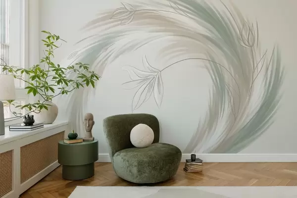 Fototapeten grüne und beige Federn und Blumen, handbemalt N° w04816