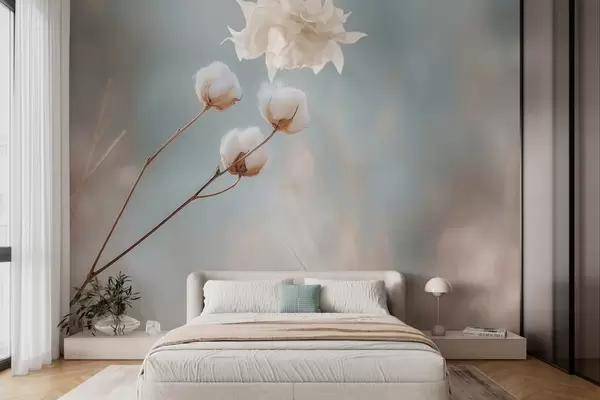 Fototapeten drei Baumwollblüten auf einem verschwommenen Hintergrund N° w04820