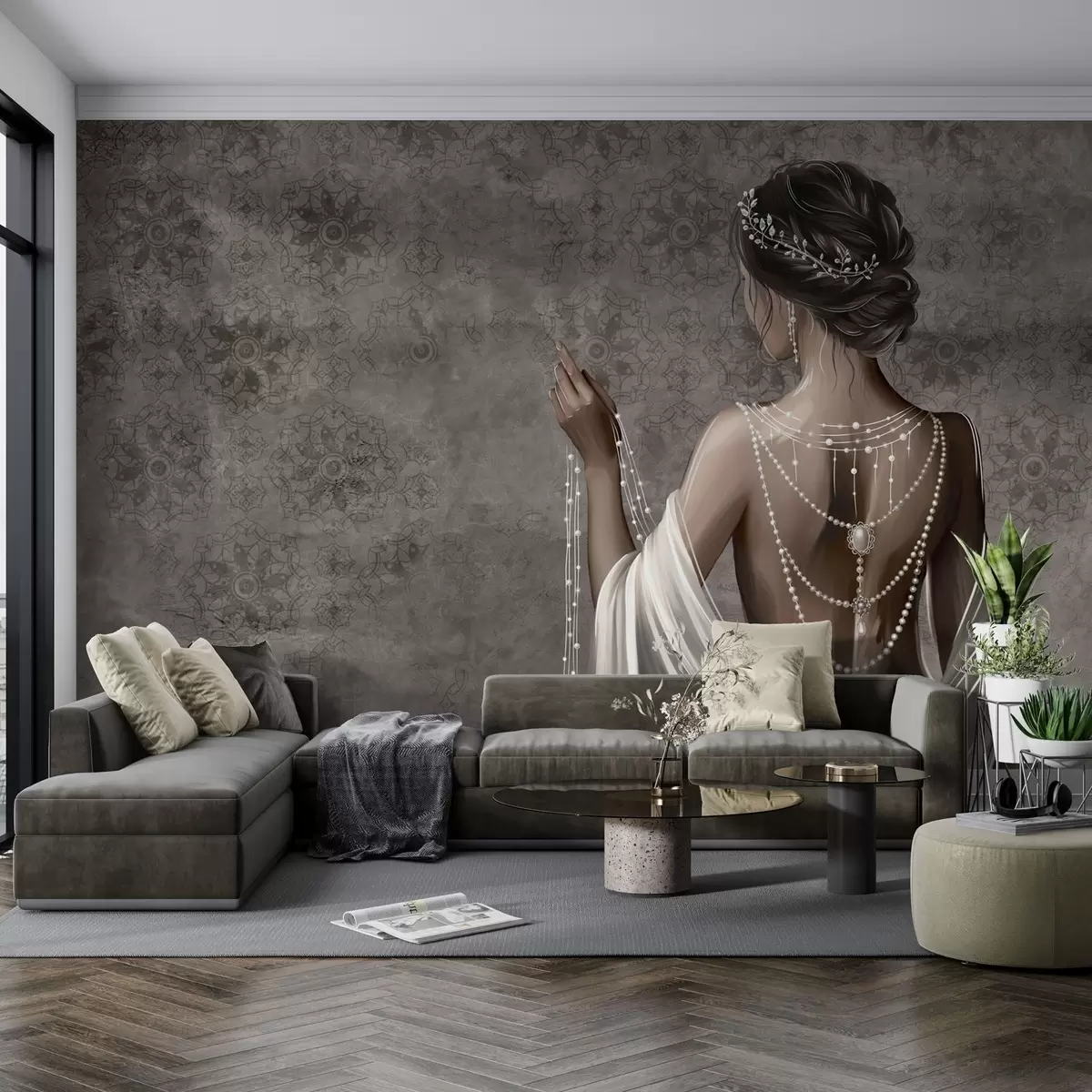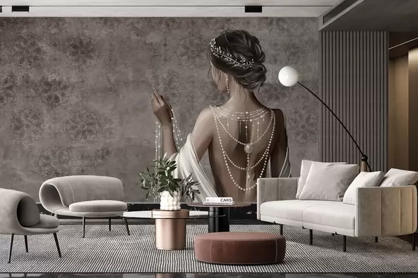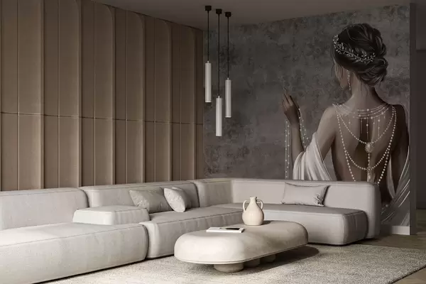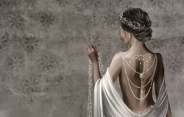 Fototapeten Frau von hinten gesehen mit Perlen, grauer Hintergrund mit Steinmuster N° w04854