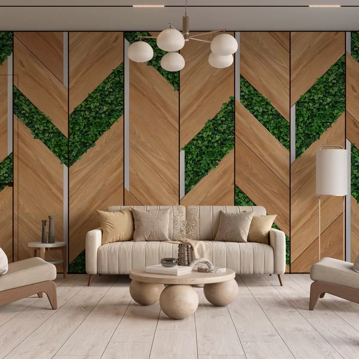 Fototapeten Imitation von hellen Holzpaneelen mit Pflanzeneinsätzen N° w04875