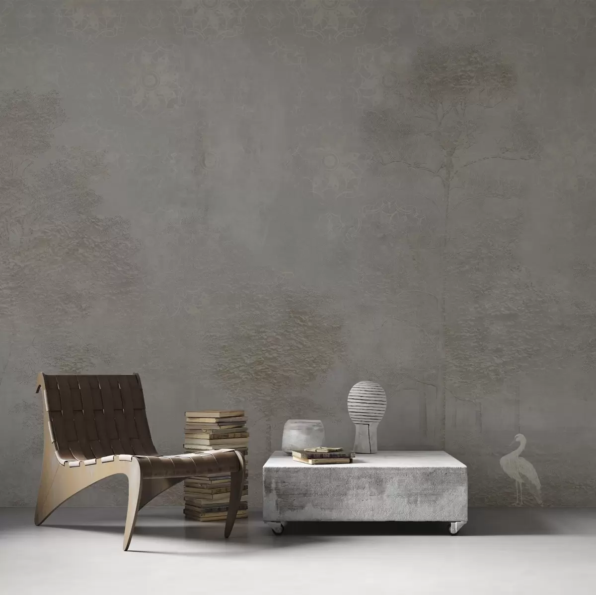 Fototapeten Nebelverhangener Wald mit einem Reiher und einem ornamentalen Muster darüber N° w04953v1