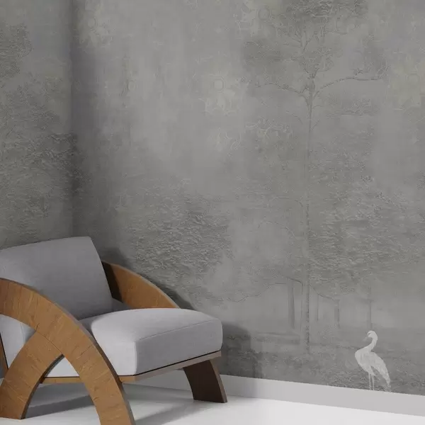 Fototapeten Leichter Nebelwald mit einem Reiher in kühlen Grautönen N° w04953v2