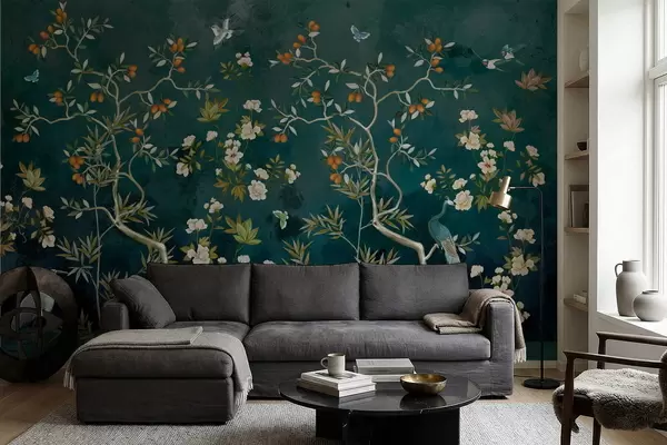 Fototapeten Dekorative Szene mit Bäumen, Blumen und Vögeln auf dunklem Hintergrund N° w05004