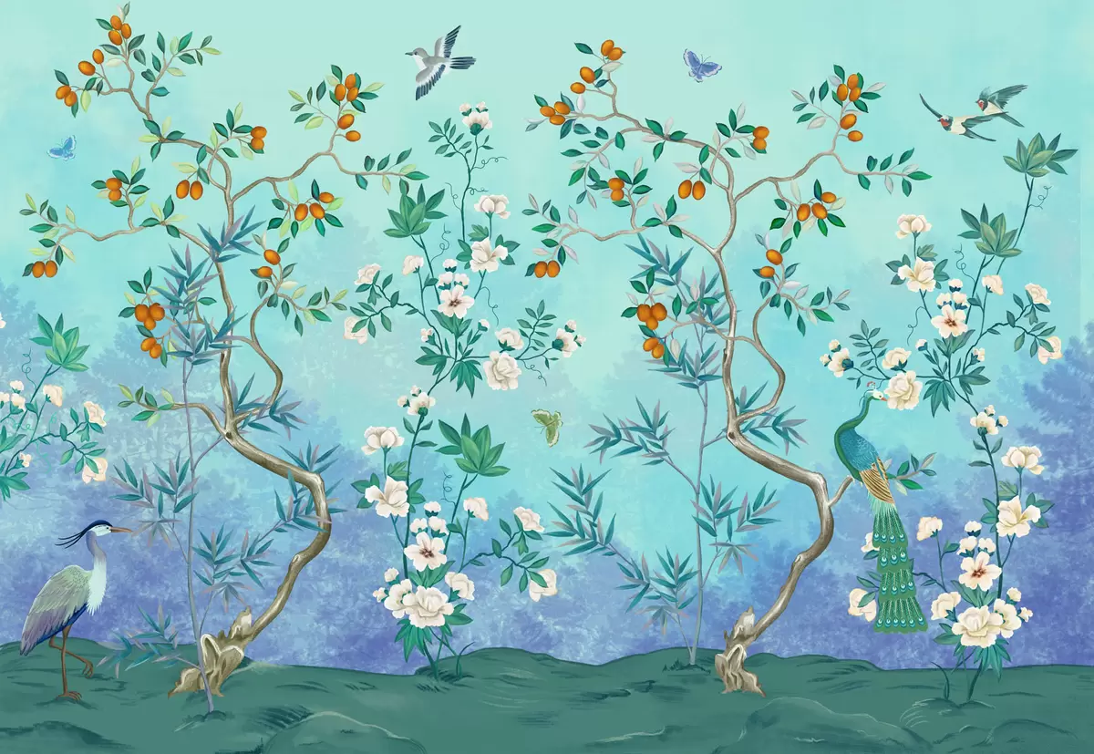 Fototapeten Szene mit Bäumen, Blumen und Vögeln, blauer Hintergrund N° w05004v2