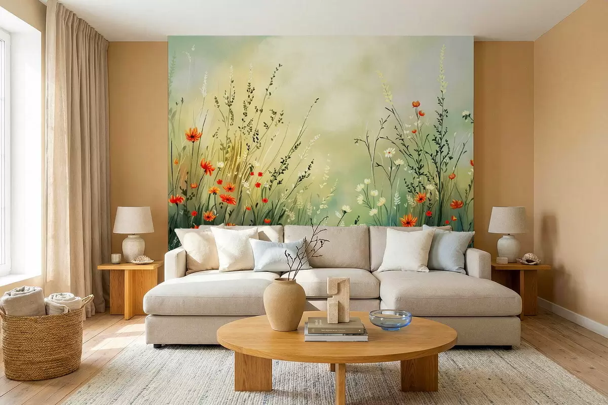 Fototapeten Wiesenblumen und Gräser in sanftem, malerischem Stil N° w05015