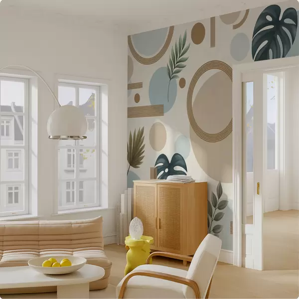 Fototapeten Geometrisches Muster mit Blättern und Kreisen in ruhigen Farbtönen N° w05018