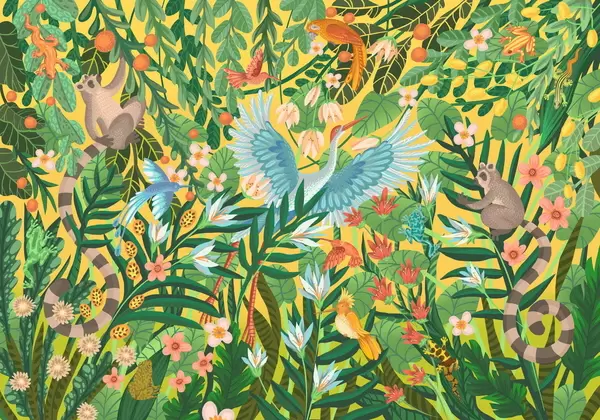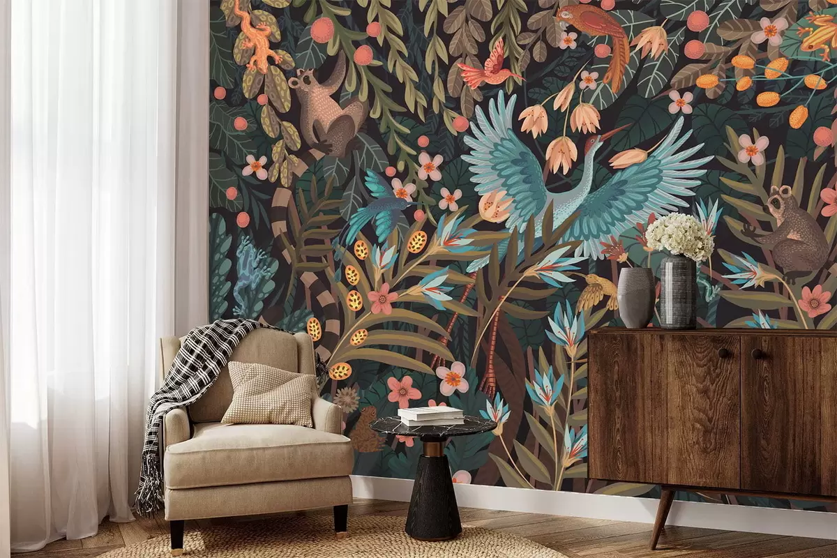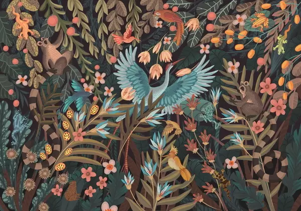 Fototapeten Fantasievolle Szene mit Vögeln und Tieren inmitten von Pflanzen N° w05024