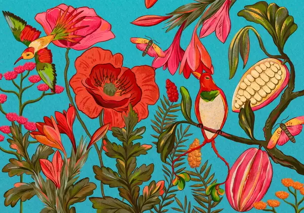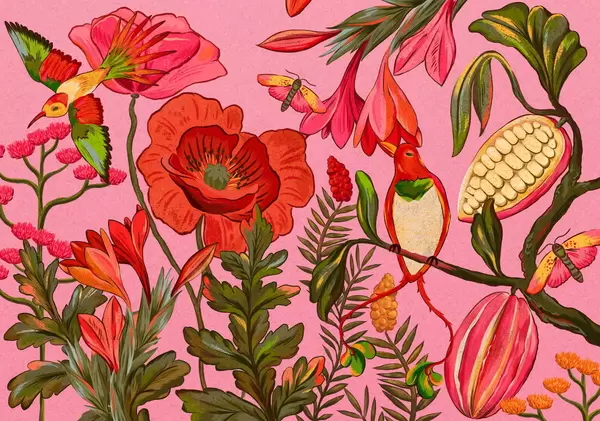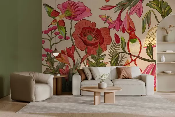 Fototapeten Dekorative Blumen und Vögel auf beigem Hintergrund N° w05036