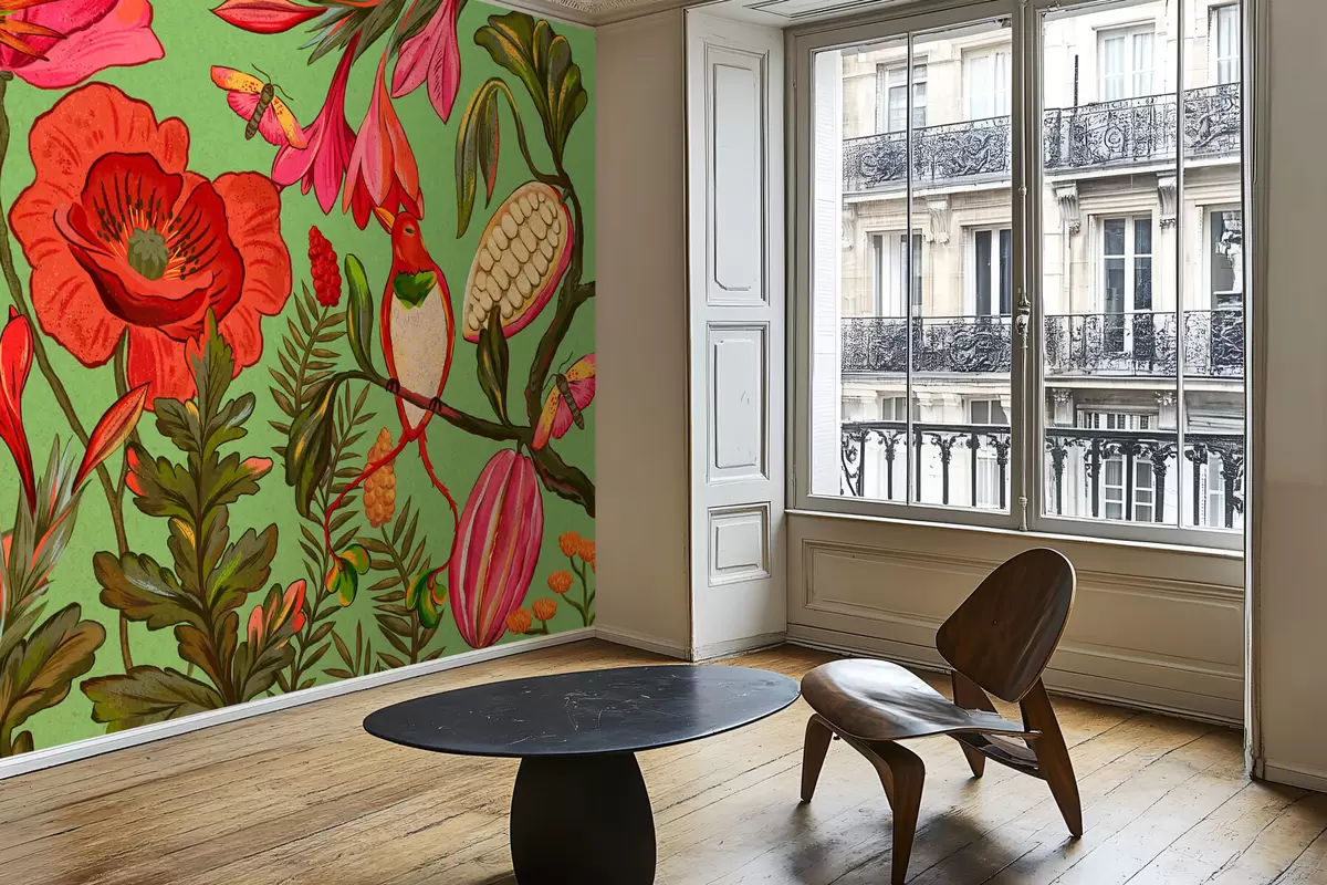 Fototapeten Dekorative Blumen und Vögel auf grünem Hintergrund N° w05036v1