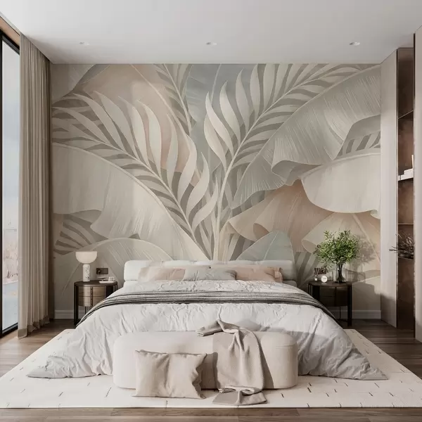 Fototapeten große tropische Blätter in Pfirsich- und mattem Türkistönen N° w05062