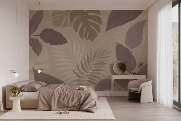 Fototapeten strukturierte tropische Blätter auf sandigem Hintergrund N° w05063