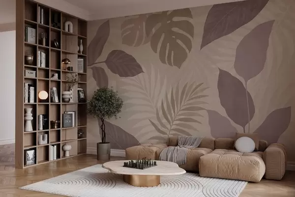 Fototapeten strukturierte tropische Blätter auf sandigem Hintergrund N° w05063