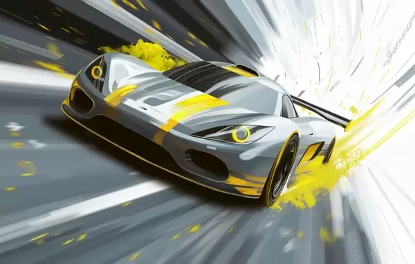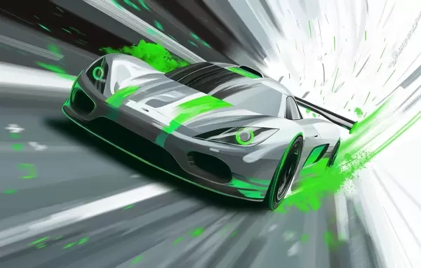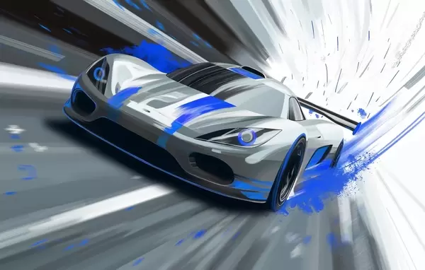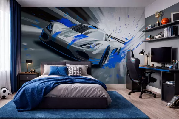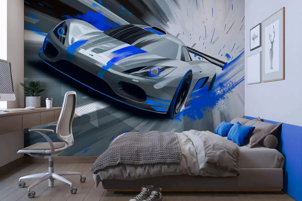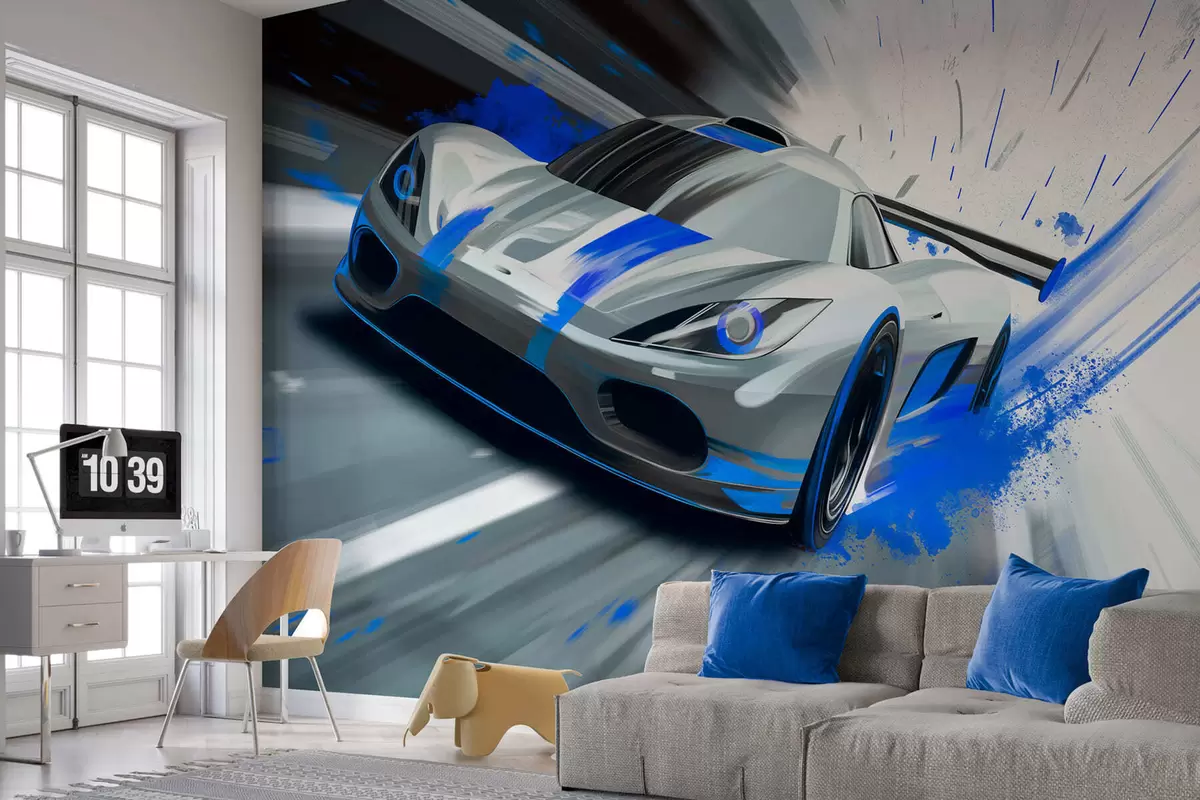 Fototapeten Dynamischer Sportwagen im digitalen Zeichenstil mit blauen Akzenten N° w05069