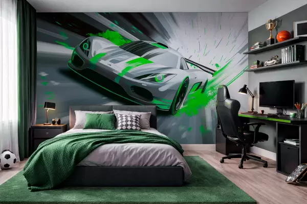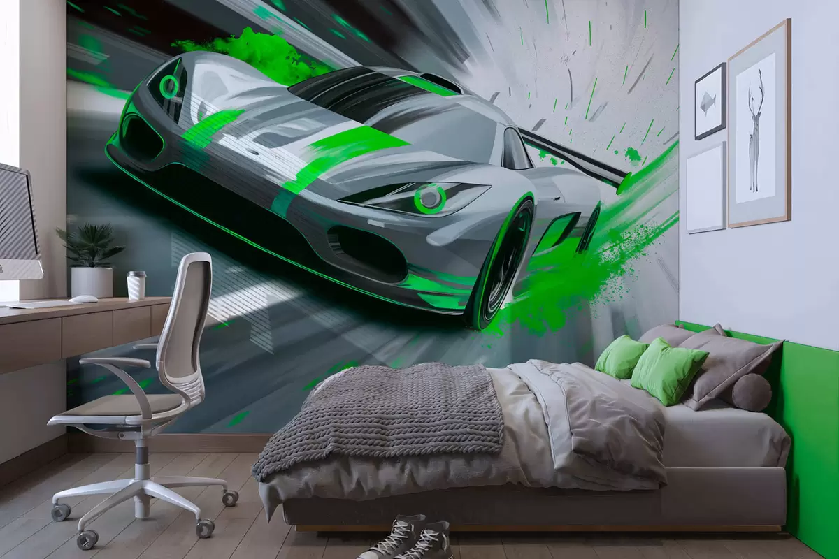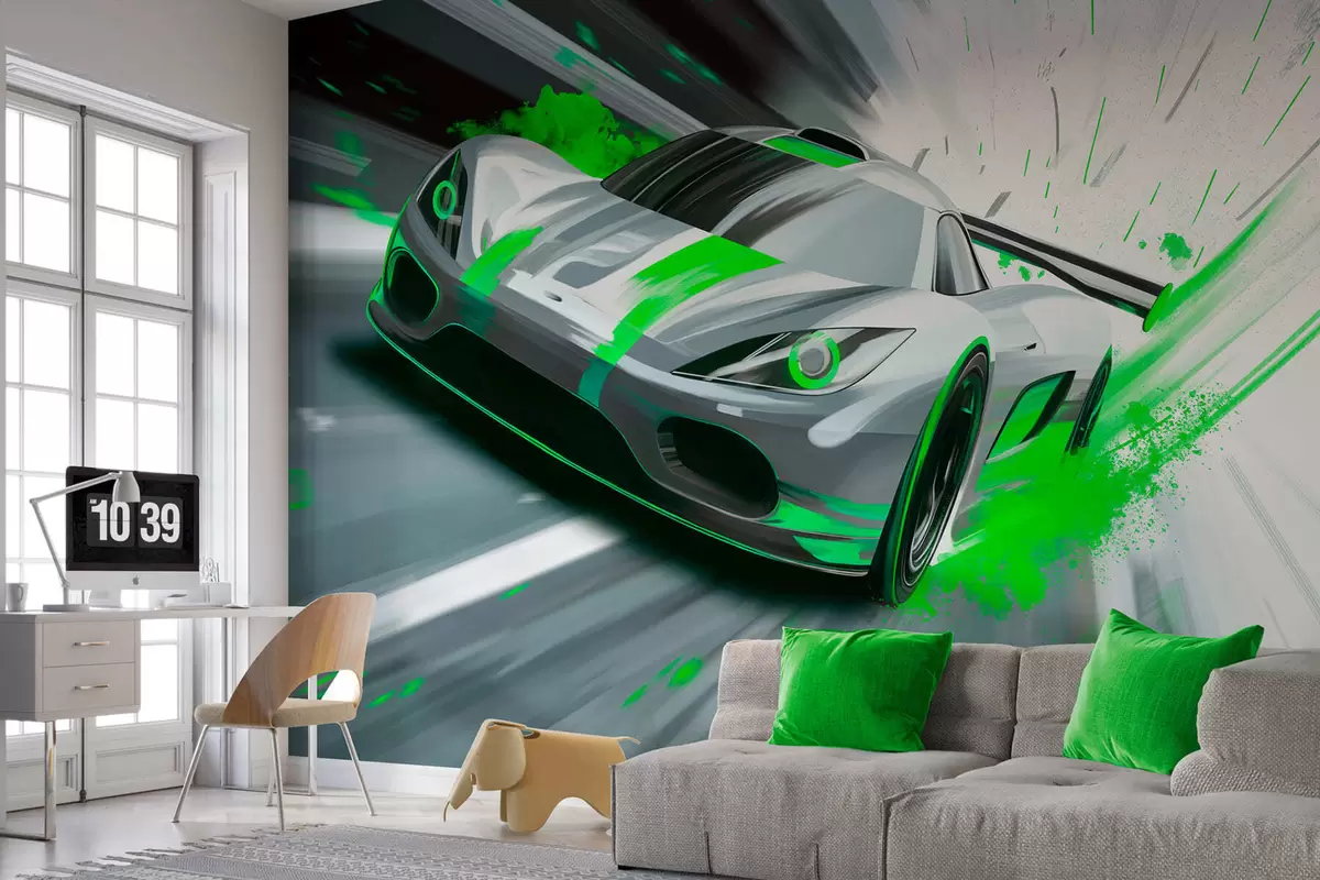 Fototapeten Dynamischer Sportwagen im digitalen Zeichenstil mit grünen Akzenten N° w05069v4