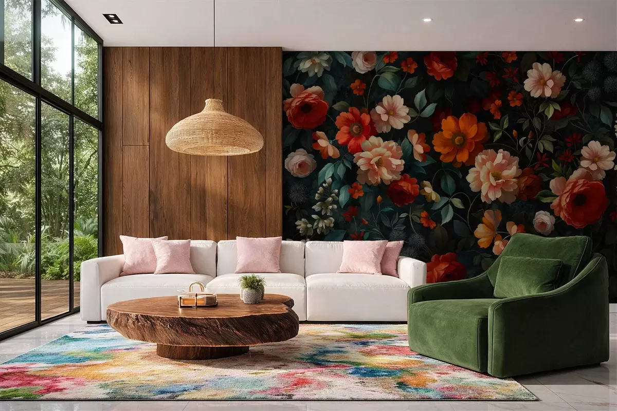 Fototapete Dunkles Blumenmuster mit üppigen Gartenblumen w05087