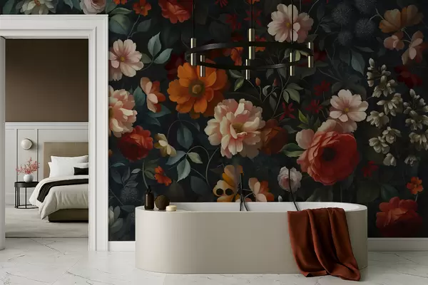 Fototapeten Dunkles Blumenmuster mit üppigen Gartenblumen N° w05087
