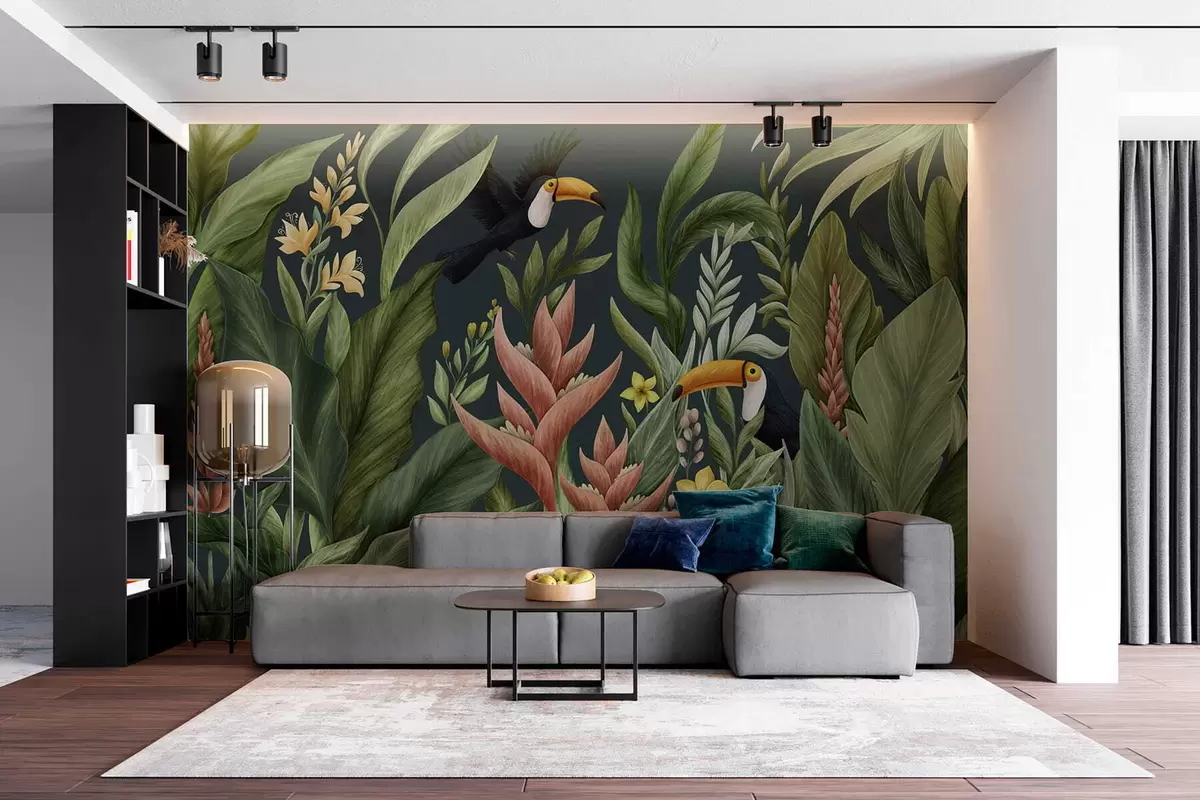 Fototapeten Tropische Pflanzen und großschnäbelige Vögel vor dunklem Hintergrund N° w05088v2