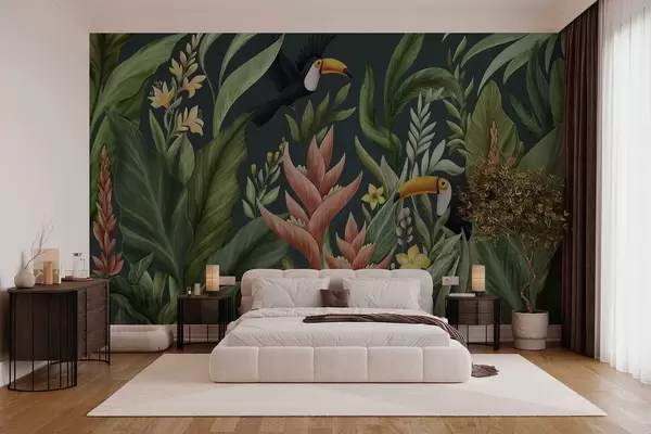 Fototapeten Tropische Pflanzen und großschnäbelige Vögel vor dunklem Hintergrund N° w05088v2