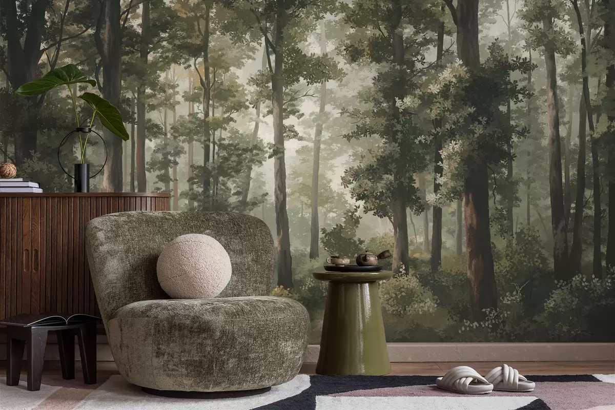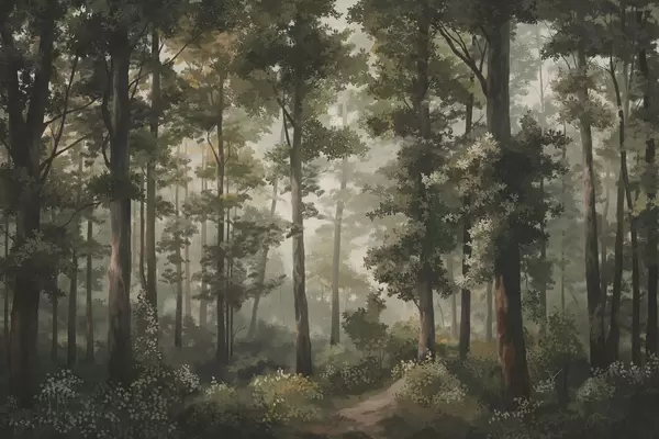 Fototapeten Waldillustration mit Nebel, hohen Bäumen und einem Weg N° w05089