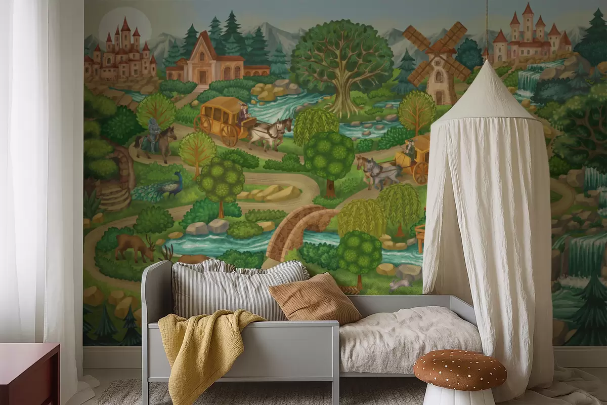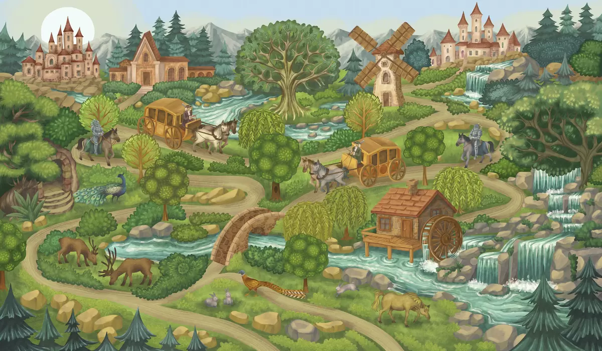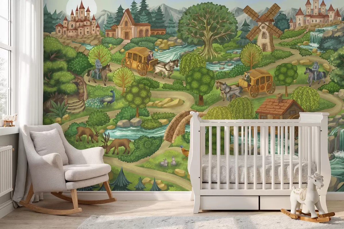 Fototapeten Märchenhafte Illustration mit Burgen, Wald, Flüssen und Reisenden N° w05091v1