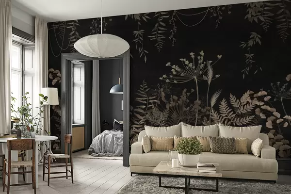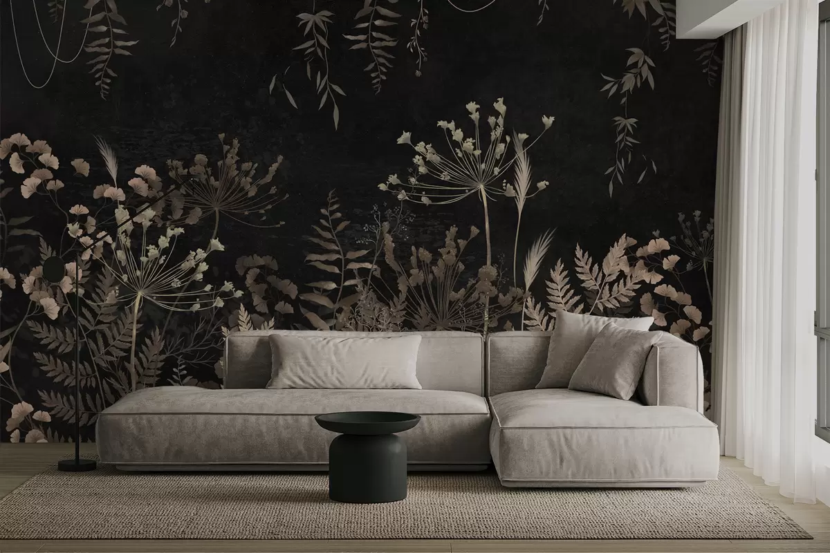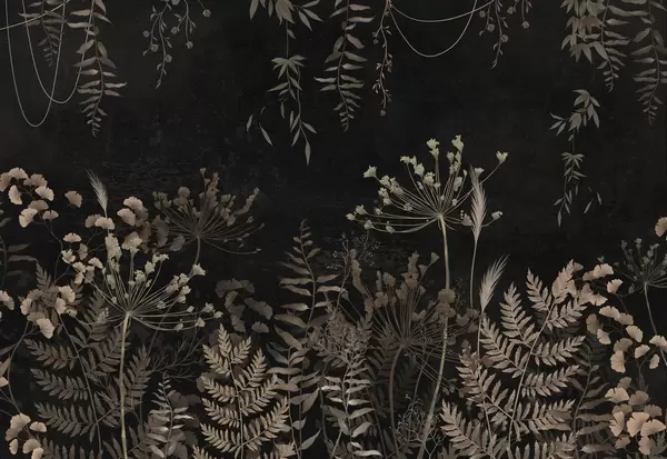 Fototapeten Dunkles botanisches Muster mit Blumen und Blättern N° w05092